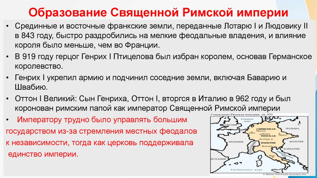 Образование Священной Римской империи• Срединные и восточные франкские земли, переданные Лотарю I и Людовику II