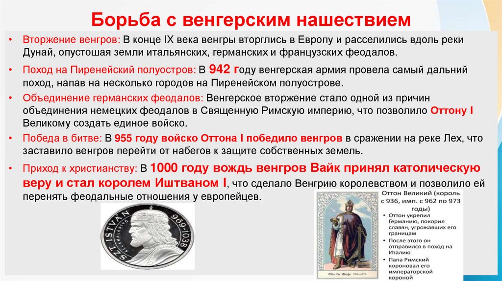 Борьба с венгерским нашествием• Вторжение венгров: В конце IX века венгры вторглись в Европу и расселились вдоль реки