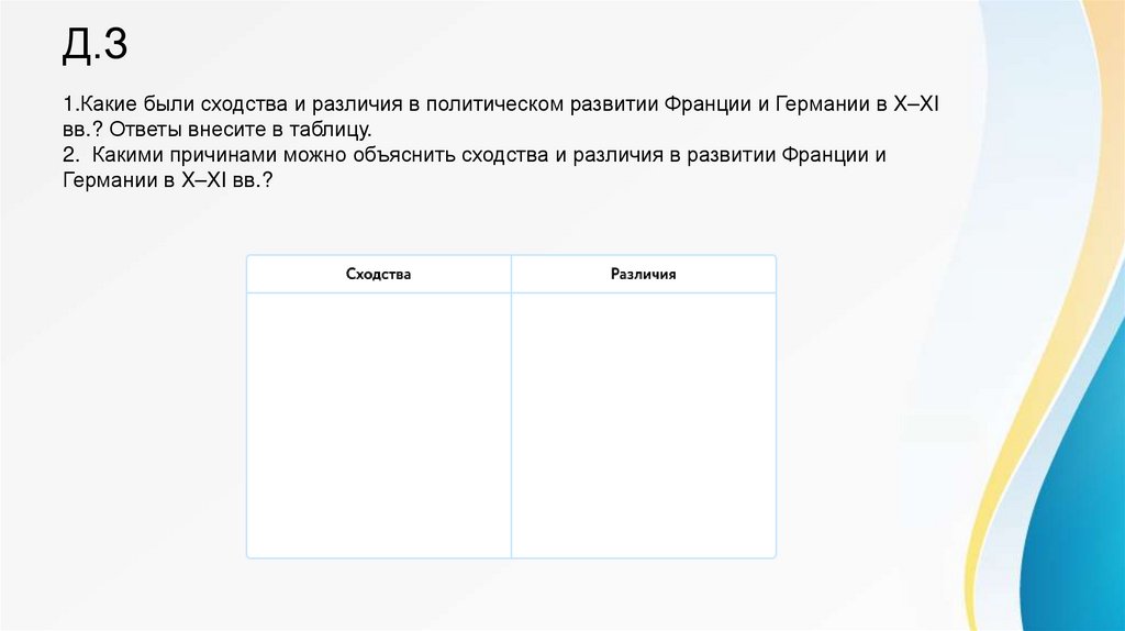 Д.З1.Какие были сходства и различия в политическом развитии Франции и Германии в X–XI