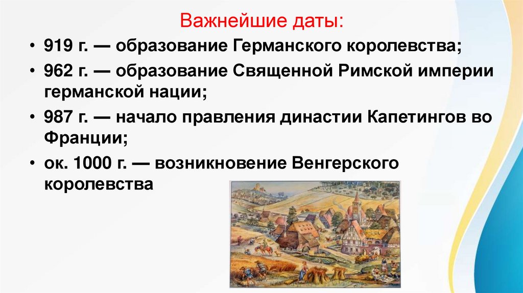 Важнейшие даты:• 919 г. ― образование Германского королевства;