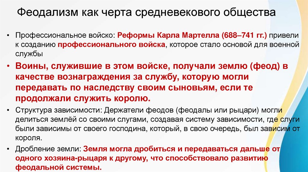 Феодализм как черта средневекового общества• Профессиональное войско: Реформы Карла Мартелла (688–741 гг.) привели