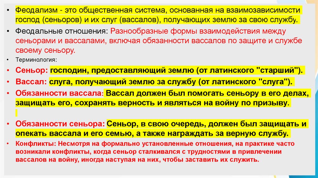 • Феодализм - это общественная система, основанная на взаимозависимостигоспод (сеньоров) и их слуг (вассалов), получающих землю за свою службу.