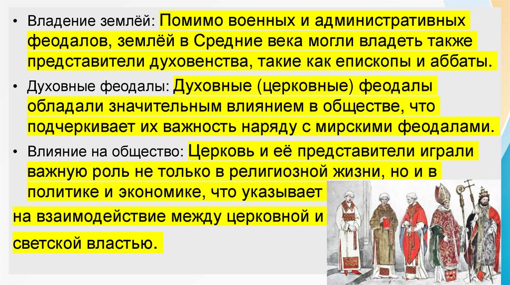 • Владение землёй: Помимо военных и административныхфеодалов, землёй в Средние века могли владеть также