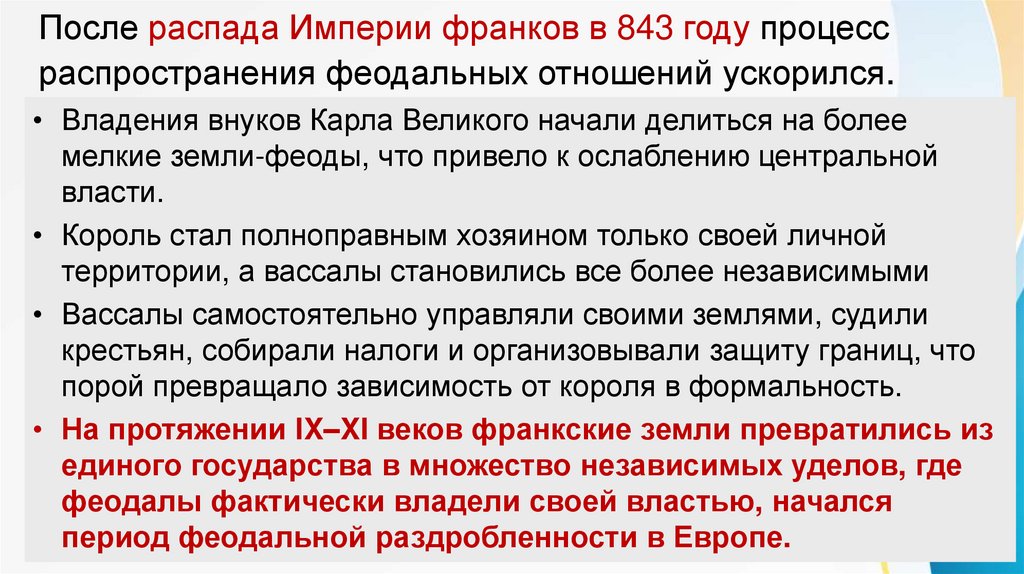 После распада Империи франков в 843 году процессраспространения феодальных отношений ускорился.