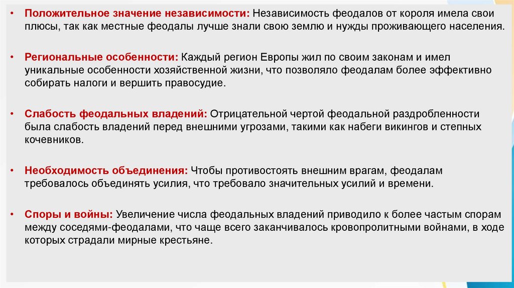 • Положительное значение независимости: Независимость феодалов от короля имела своиплюсы, так как местные феодалы лучше знали свою землю и нужды проживающего населения.