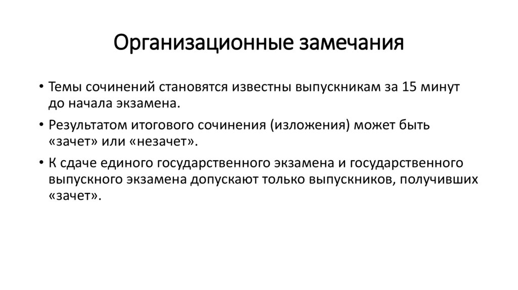 Организационные замечания• Темы сочинений становятся известны выпускникам за 15 минут