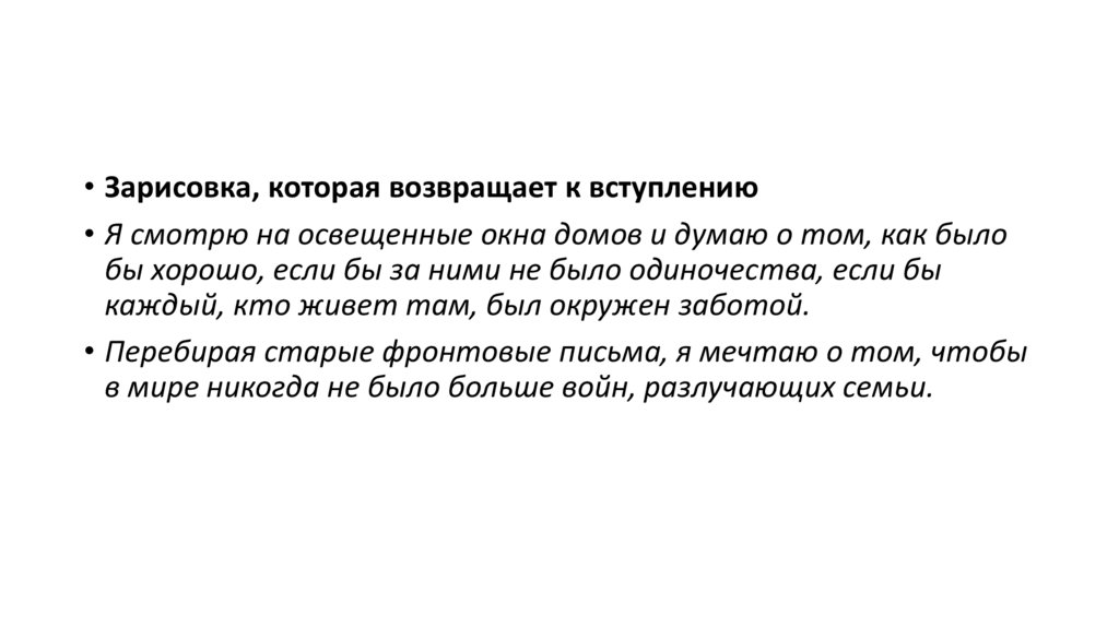 • Зарисовка, которая возвращает к вступлению• Я смотрю на освещенные окна домов и думаю о том, как было