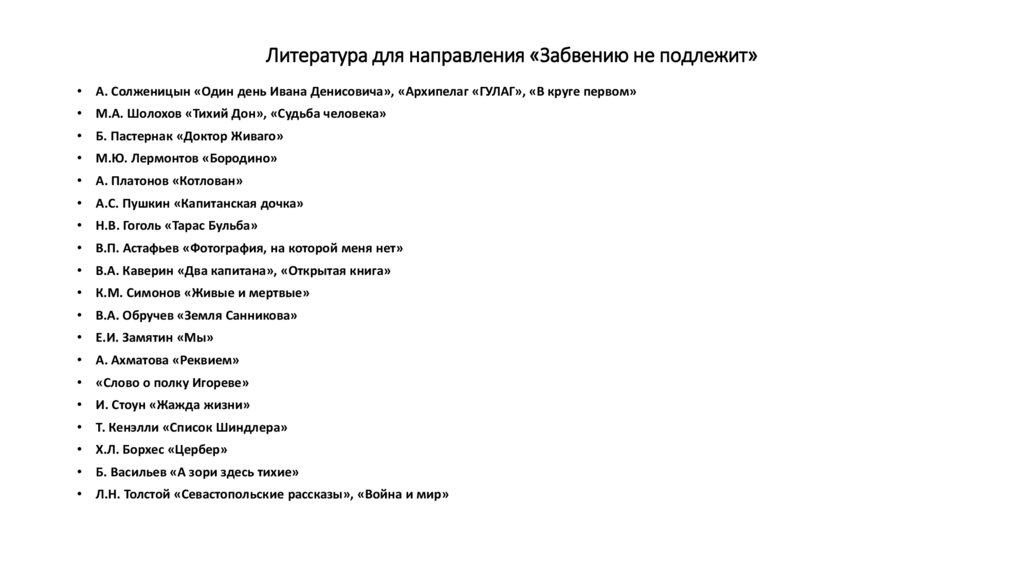 Литература для направления «Забвению не подлежит»А. Солженицын «Один день Ивана Денисовича», «Архипелаг «ГУЛАГ», «В круге первом»