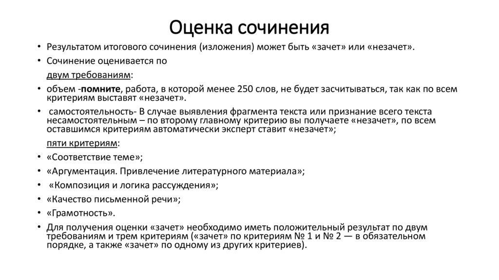 Оценка сочинения• Результатом итогового сочинения (изложения) может быть «зачет» или «незачет».