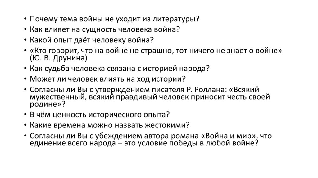 • Почему тема войны не уходит из литературы?• Как влияет на сущность человека война?