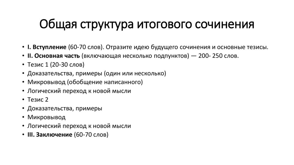 Общая структура итогового сочинения• I. Вступление (60-70 слов). Отразите идею будущего сочинения и основные тезисы.