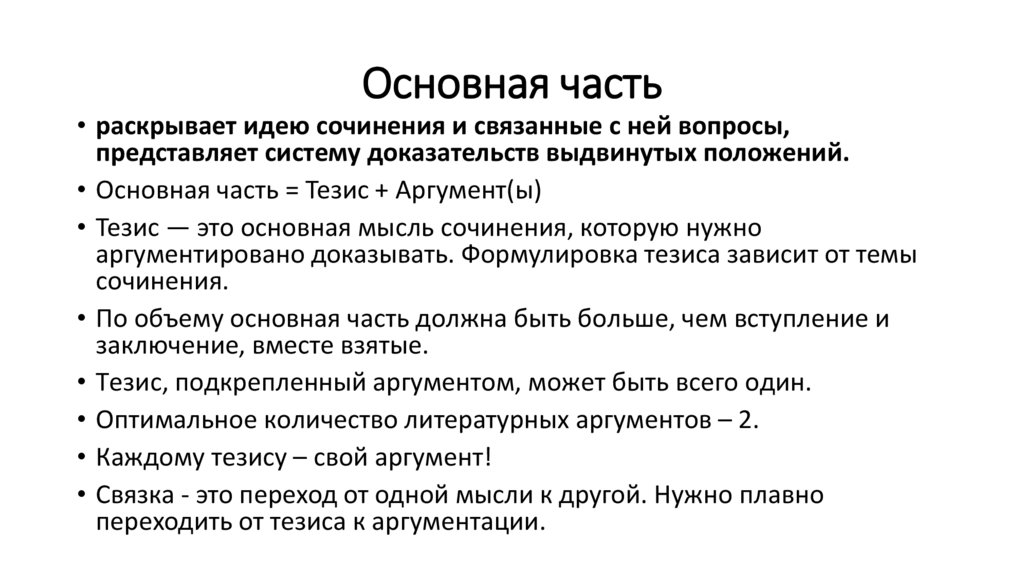 Основная часть• раскрывает идею сочинения и связанные с ней вопросы,