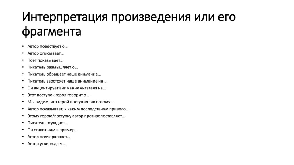 •Его интерпретацию - здесь мы обращаемся к сюжету произведения или конкретному эпизоду,