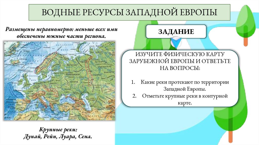 ВОДНЫЕ РЕСУРСЫ ЗАПАДНОЙ ЕВРОПЫРазмещены неравномерно: меньше всех ими