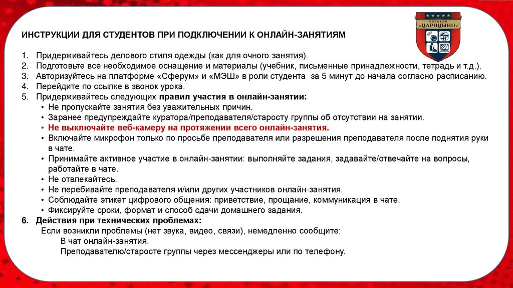 ИНСТРУКЦИИ ДЛЯ СТУДЕНТОВ ПРИ ПОДКЛЮЧЕНИИ К ОНЛАЙН-ЗАНЯТИЯМПридерживайтесь делового стиля одежды (как для очного занятия).