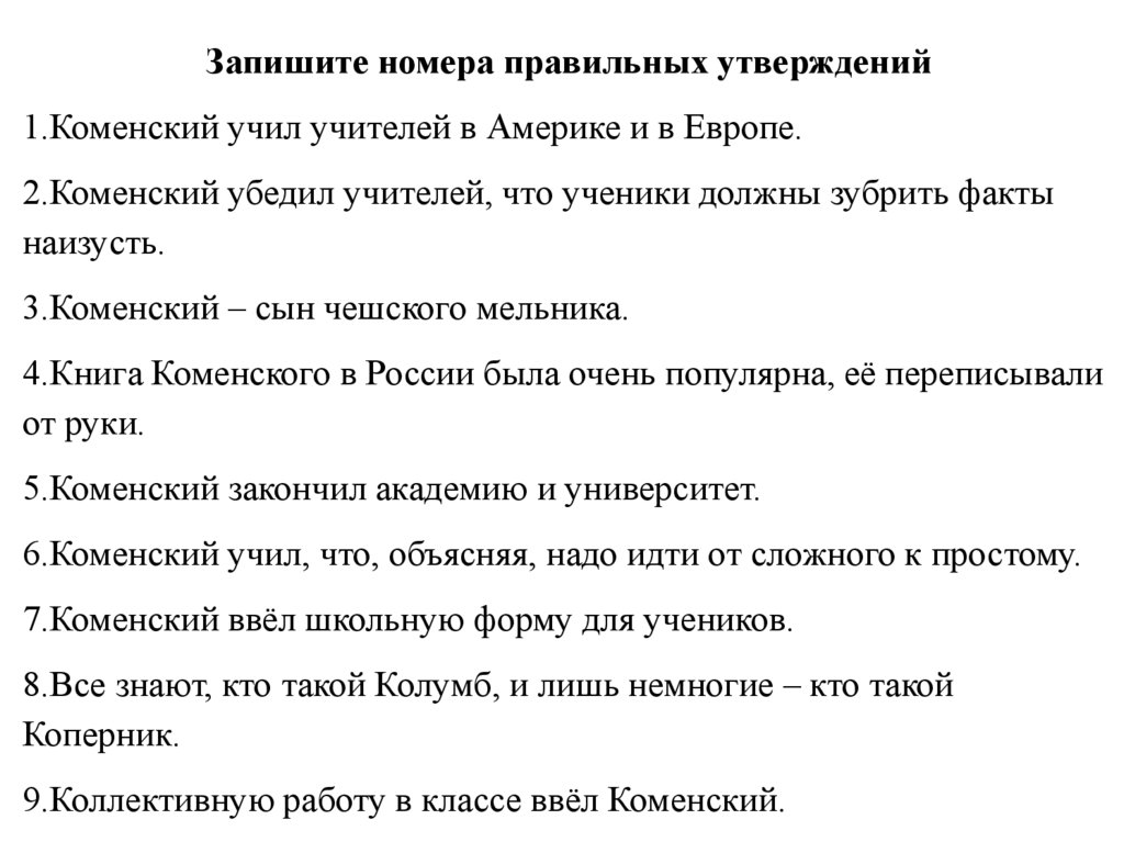 Запишите номера правильных утверждений1.Коменский учил учителей в Америке и в Европе.
