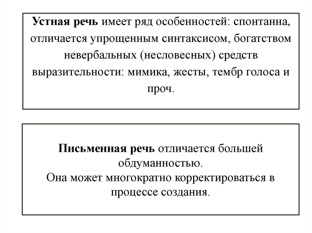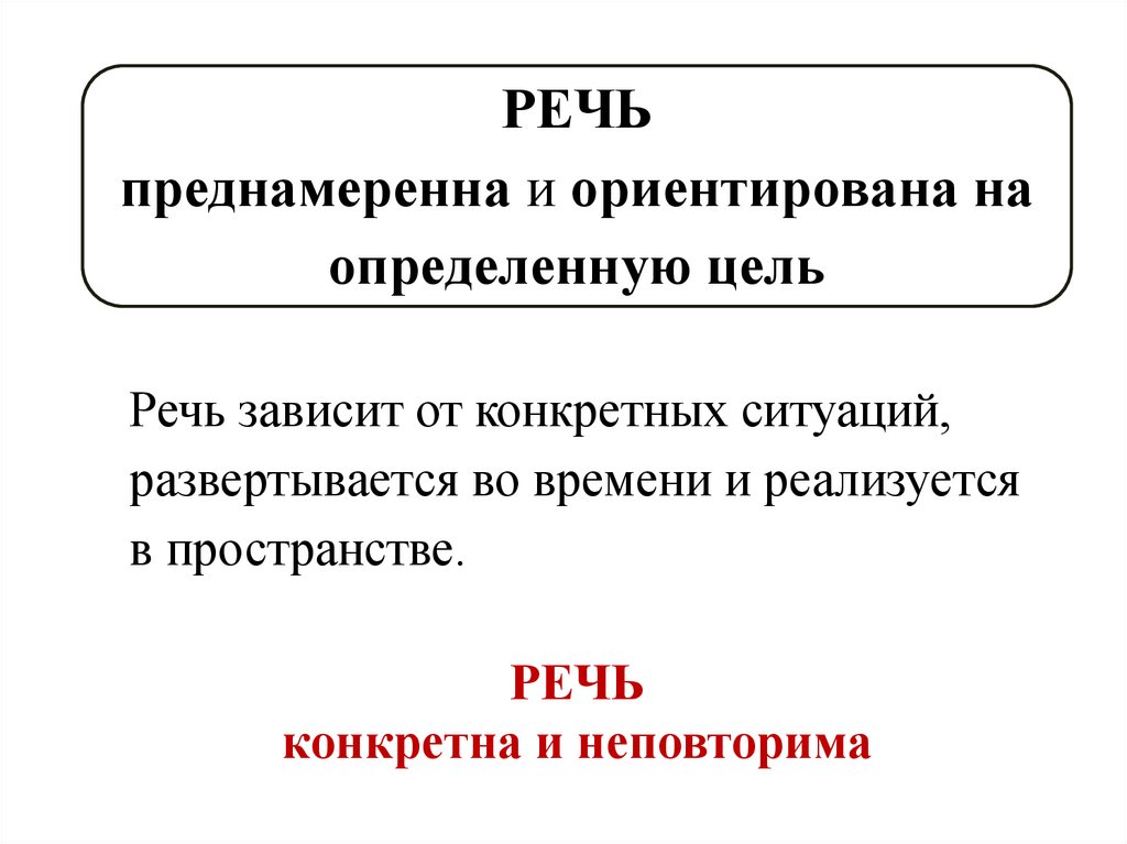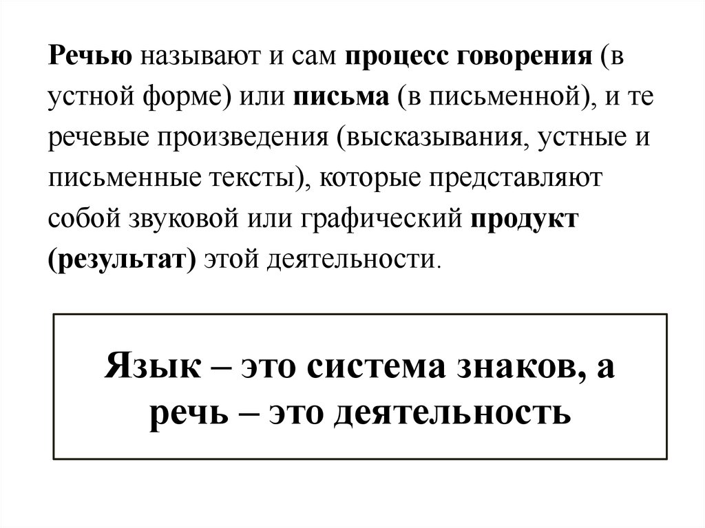 Речью называют и сам процесс говорения (вустной форме) или письма (в письменной), и те
