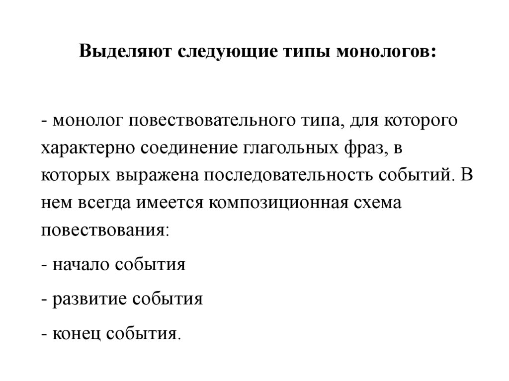 Выделяют следующие типы монологов:- монолог повествовательного типа, для которого