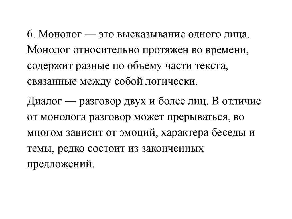 6. Монолог — это высказывание одного лица.Монолог относительно протяжен во времени,
