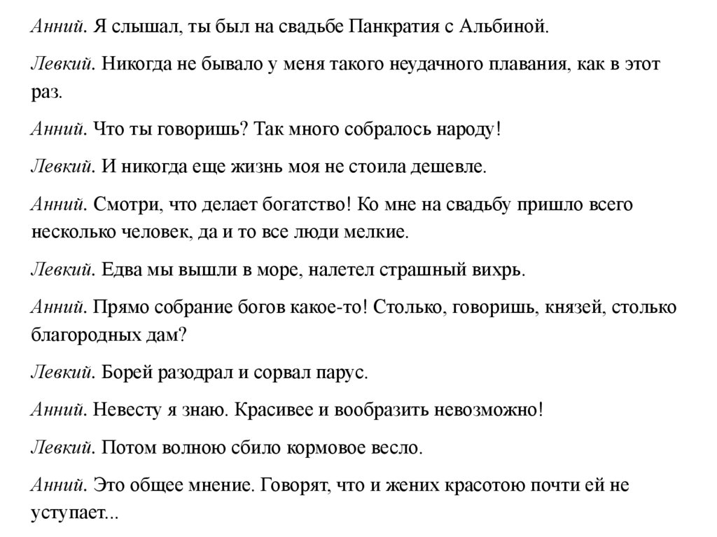Анний. Я слышал, ты был на свадьбе Панкратия с Альбиной.Левкий. Никогда не бывало у меня такого неудачного плавания, как в этот
