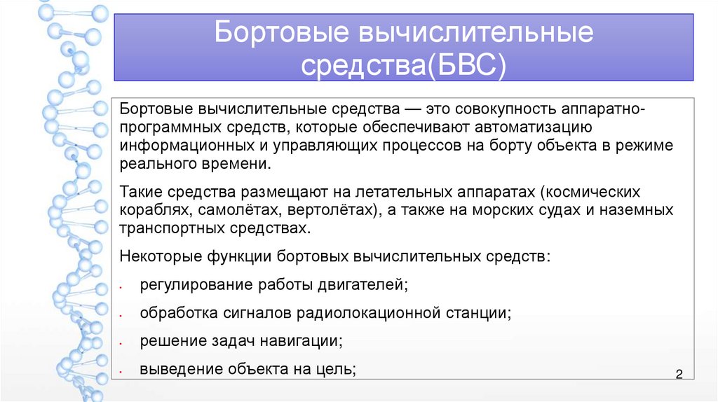 Бортовые вычислительные средства — это совокупность аппаратнопрограммных средств, которые обеспечивают автоматизацию