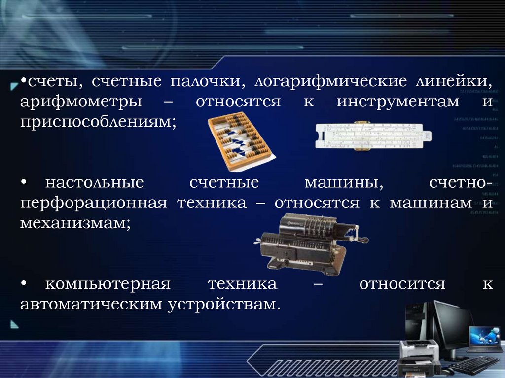 счеты, счетные палочки, логарифмические линейки,арифмометры – относятся к инструментам и