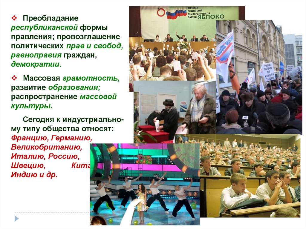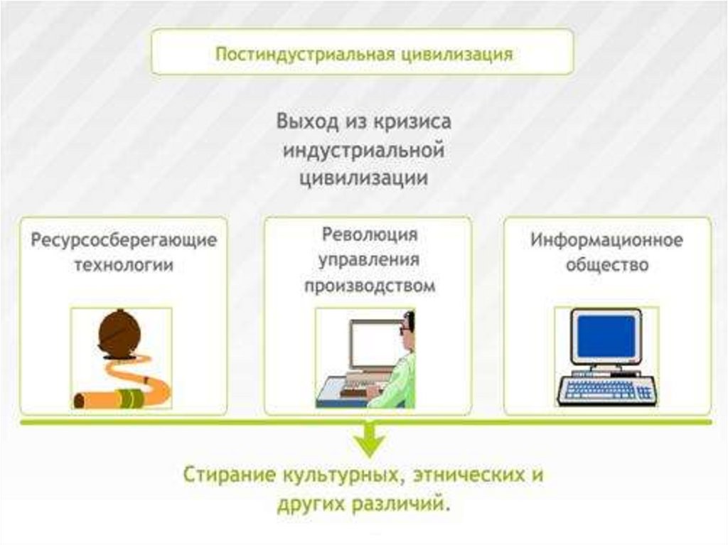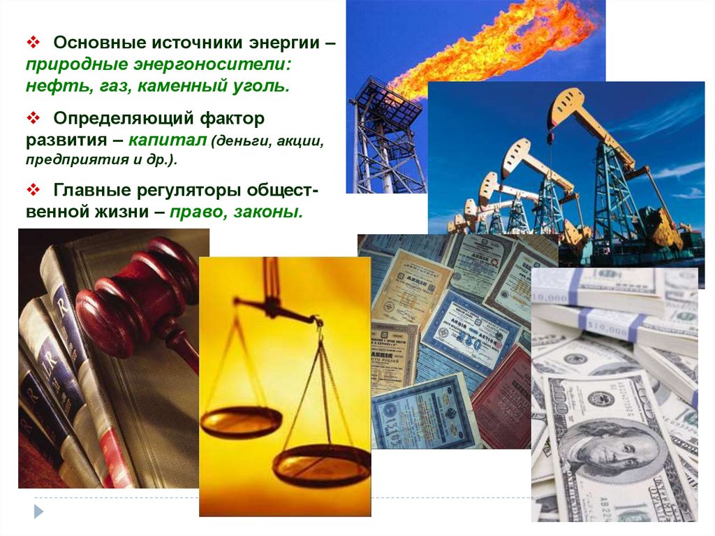 Экономика Развитая фабричная промышленность; интенсив-ные методы производства; автоматизация и механизация производства; конвейер; массовое производство; частная собственность; урбанизация