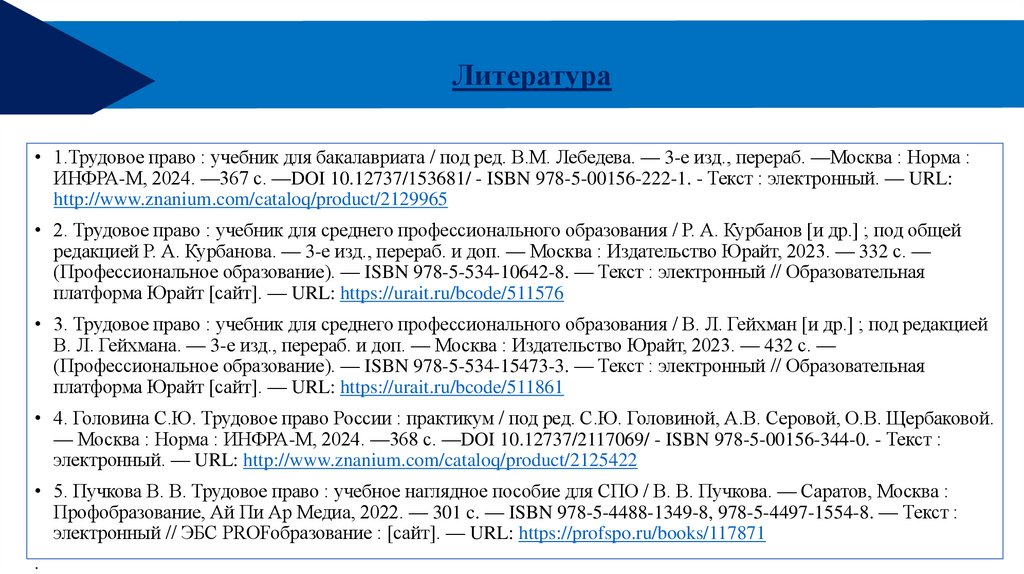 • 1.Трудовое право : учебник для бакалавриата / под ред. В.М. Лебедева. — 3-е изд., перераб. —Москва : Норма :