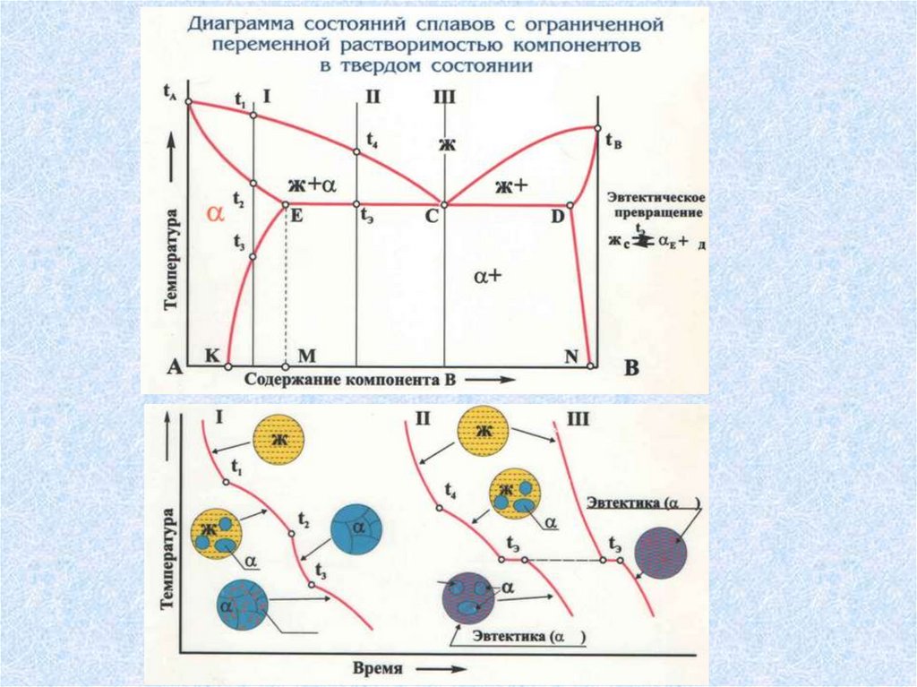 жидкий сплав и кристаллы одного из компонентов.
