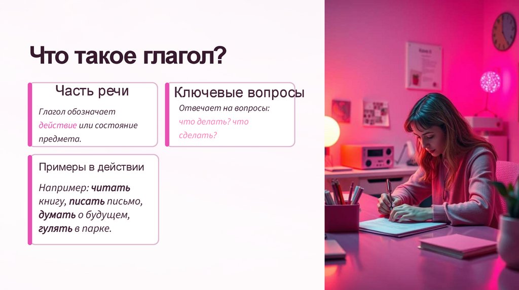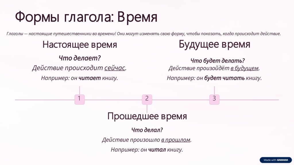 Формы глагола: ВремяГлаголы — настоящие путешественники во времени! Они могут изменять свою форму, чтобы показать, когда происходит действие.