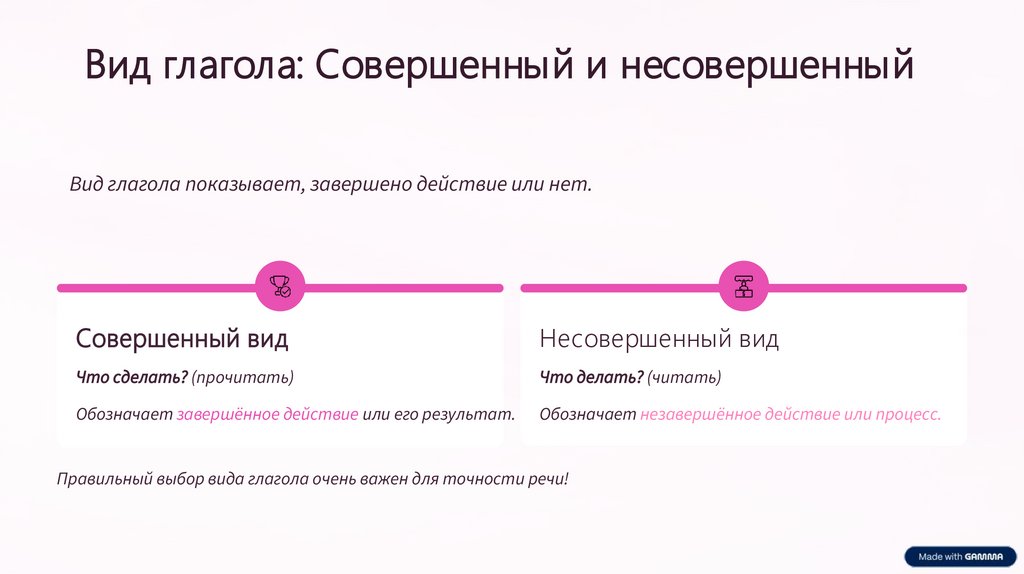 Вид глагола: Совершенный и несовершенныйВид глагола показывает, завершено действие или нет.