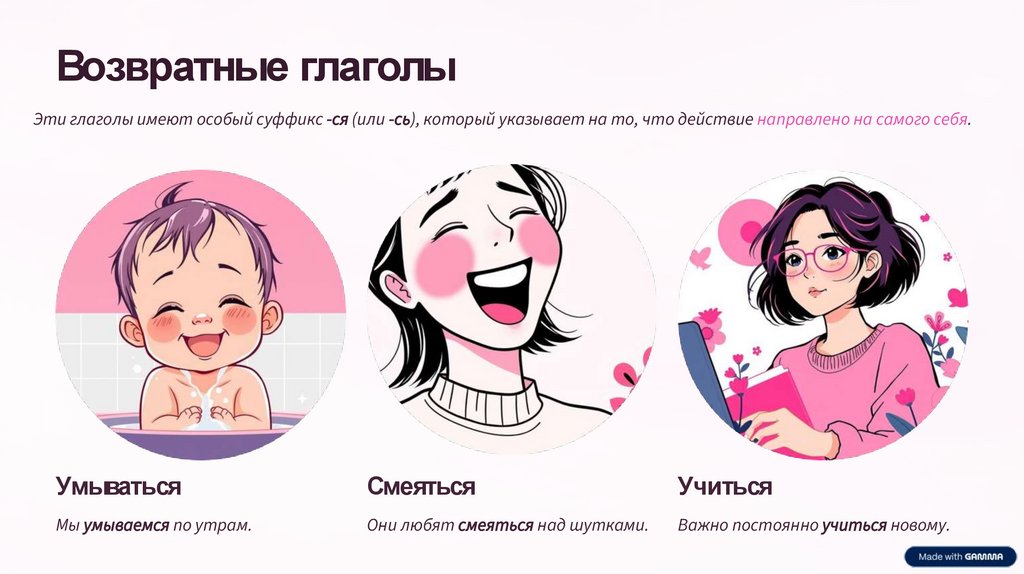 Возвратные глаголыЭти глаголы имеют особый суффикс -ся (или -сь), который указывает на то, что действие направлено на самого себя.
