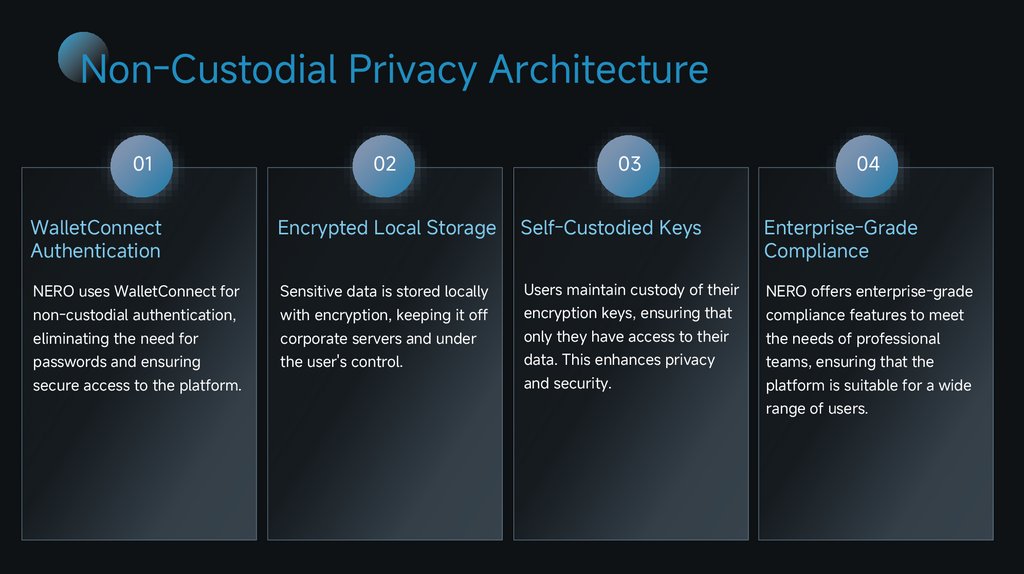 NERO's messenger features channels, private groups, voice/video calls, and file sharing, all protected by tokengated access. End-to-end encryption and self-custodied keys ensure maximum privacy and security.