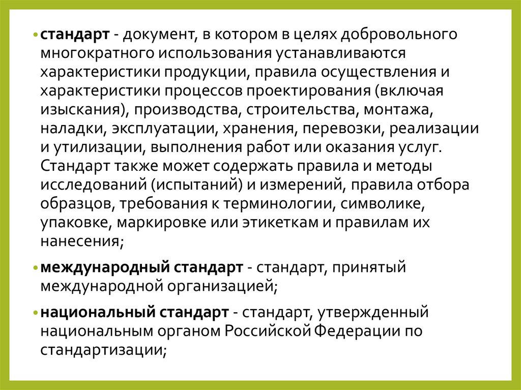 • стандарт - документ, в котором в целях добровольногомногократного использования устанавливаются