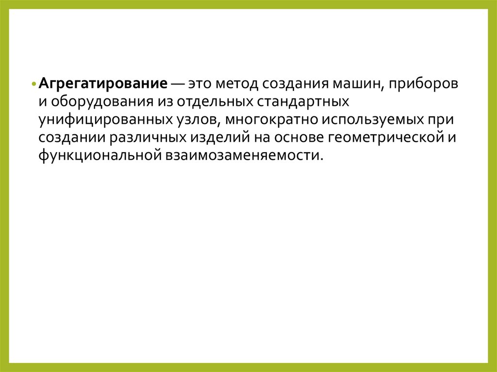 • Агрегатирование — это метод создания машин, приборови оборудования из отдельных стандартных