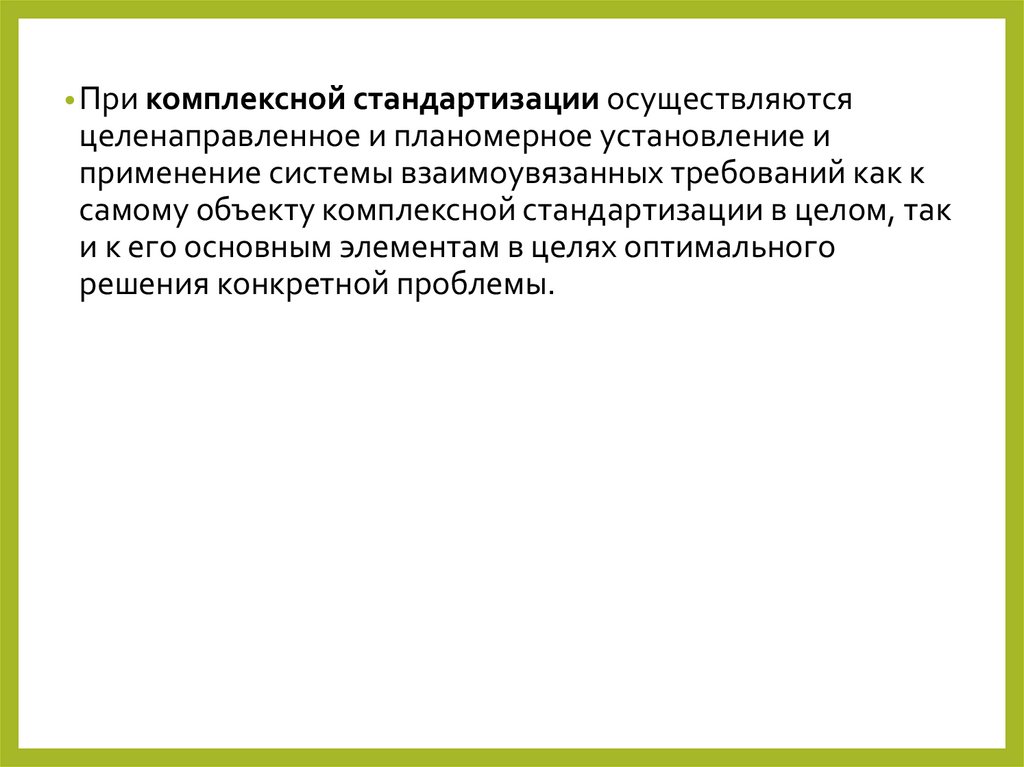 • При комплексной стандартизации осуществляютсяцеленаправленное и планомерное установление и