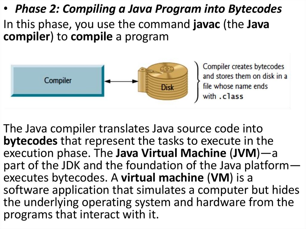 • Phase 2: Compiling a Java Program into BytecodesIn this phase, you use the command javac (the Java