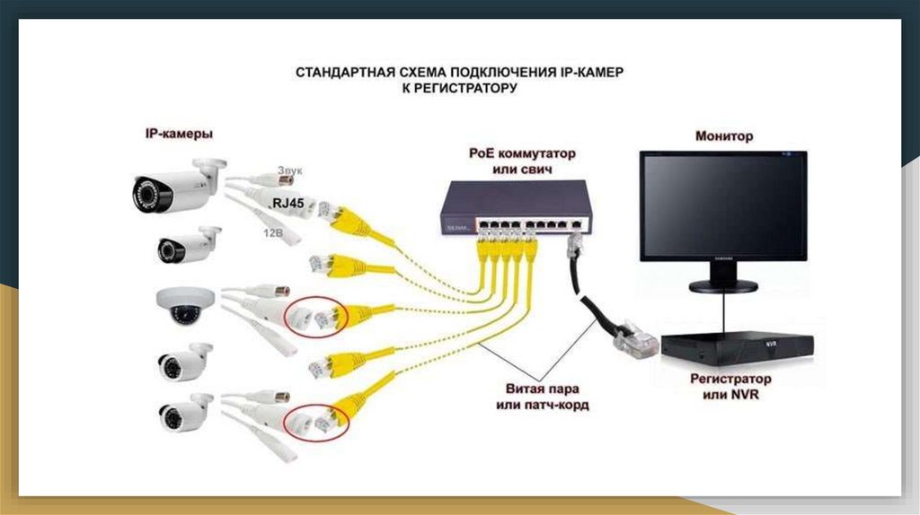 разъемы (сетевой RJ45 и питание) - 1 камера=2 RJ45 + (если не POE) - 1 питание папа в