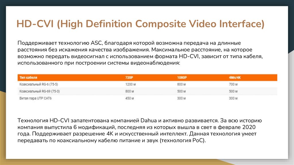 HD-CVI (High Definition Composite Video Interface)Поддерживает технологию ASC, благодаря которой возможна передача на длинные