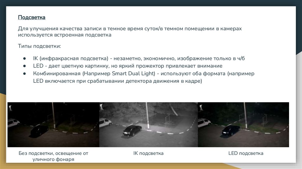 ПодсветкаДля улучшения качества записи в темное время суток/в темном помещении в камерах