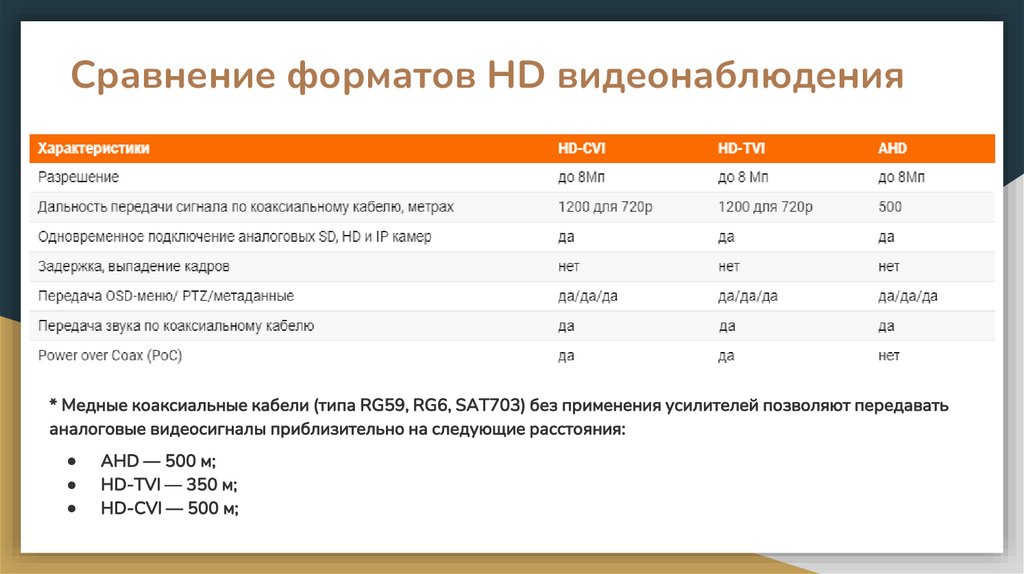 Сравнение форматов HD видеонаблюдения* Медные коаксиальные кабели (типа RG59, RG6, SAT703) без применения усилителей позволяют передавать