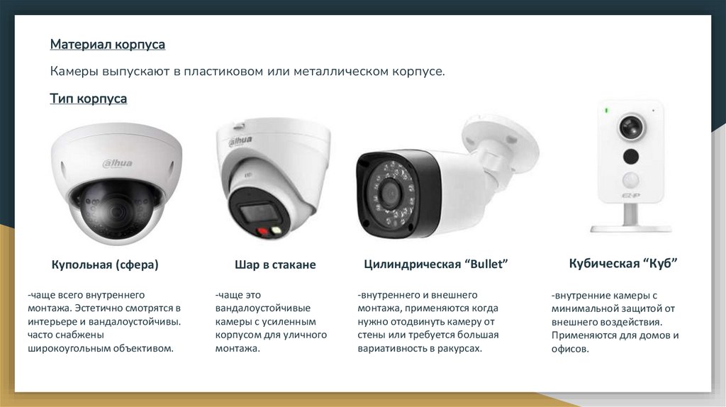 Материал корпусаКамеры выпускают в пластиковом или металлическом корпусе.