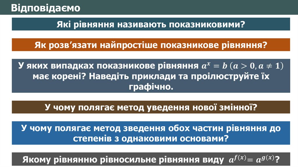 ВідповідаємоЯкі рівняння називають показниковими?
