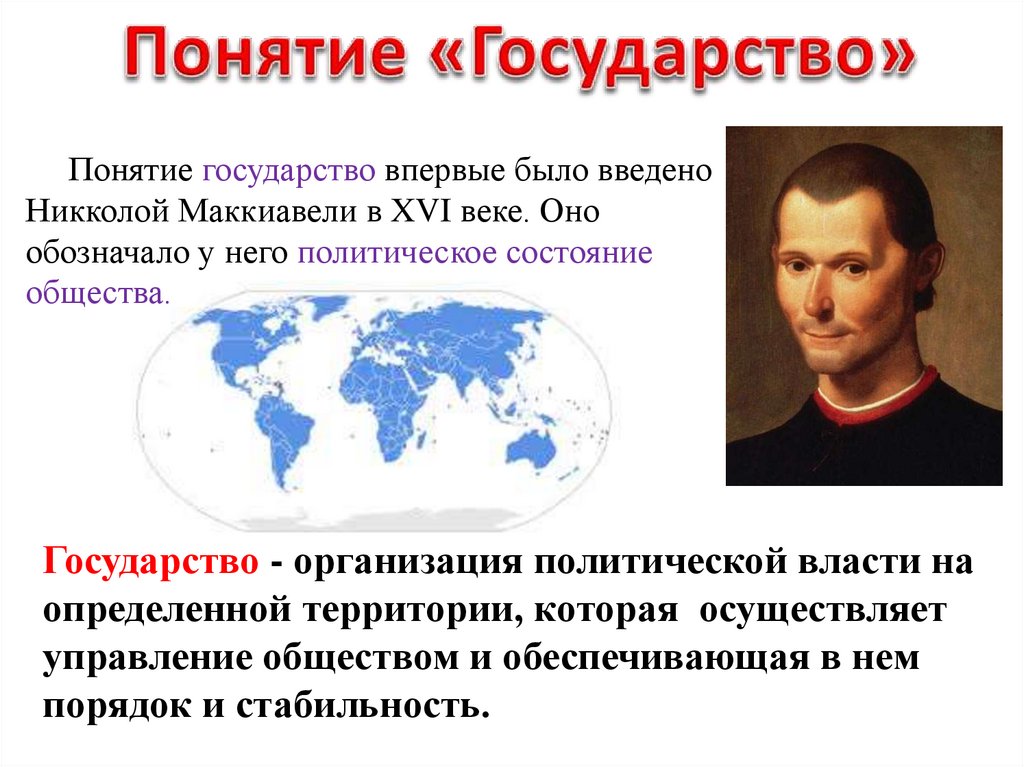 Понятие государство впервые было введеноНикколой Маккиавели в XVI веке. Оно