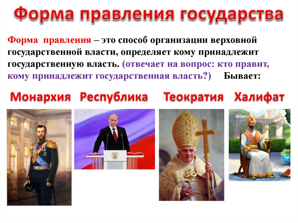 Форма правления – это способ организации верховнойгосударственной власти, определяет кому принадлежит