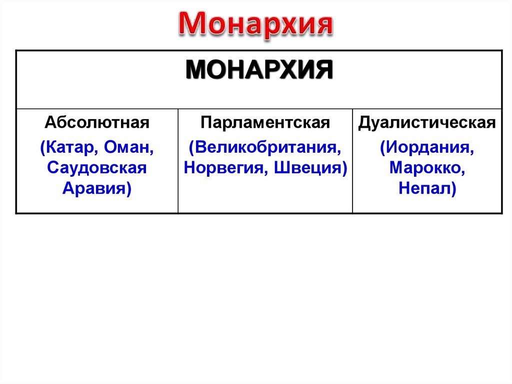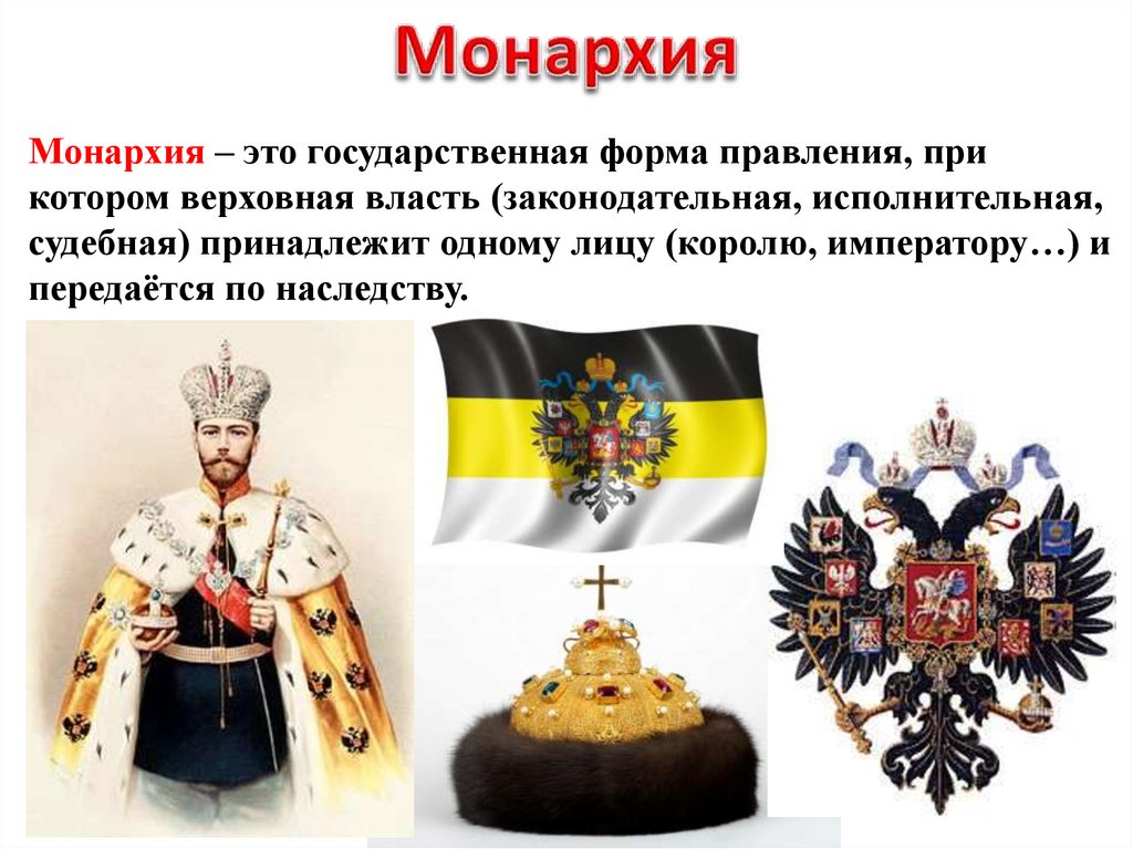 Монархия – это государственная форма правления, прикотором верховная власть (законодательная, исполнительная,