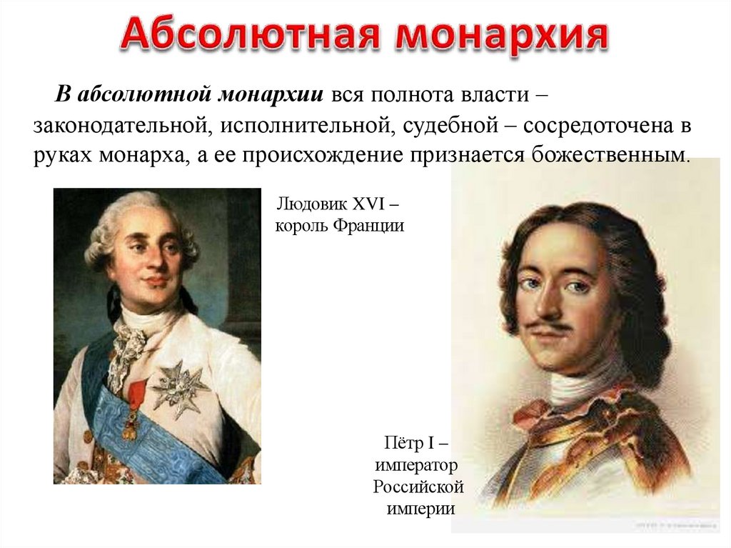 В абсолютной монархии вся полнота власти –законодательной, исполнительной, судебной – сосредоточена в