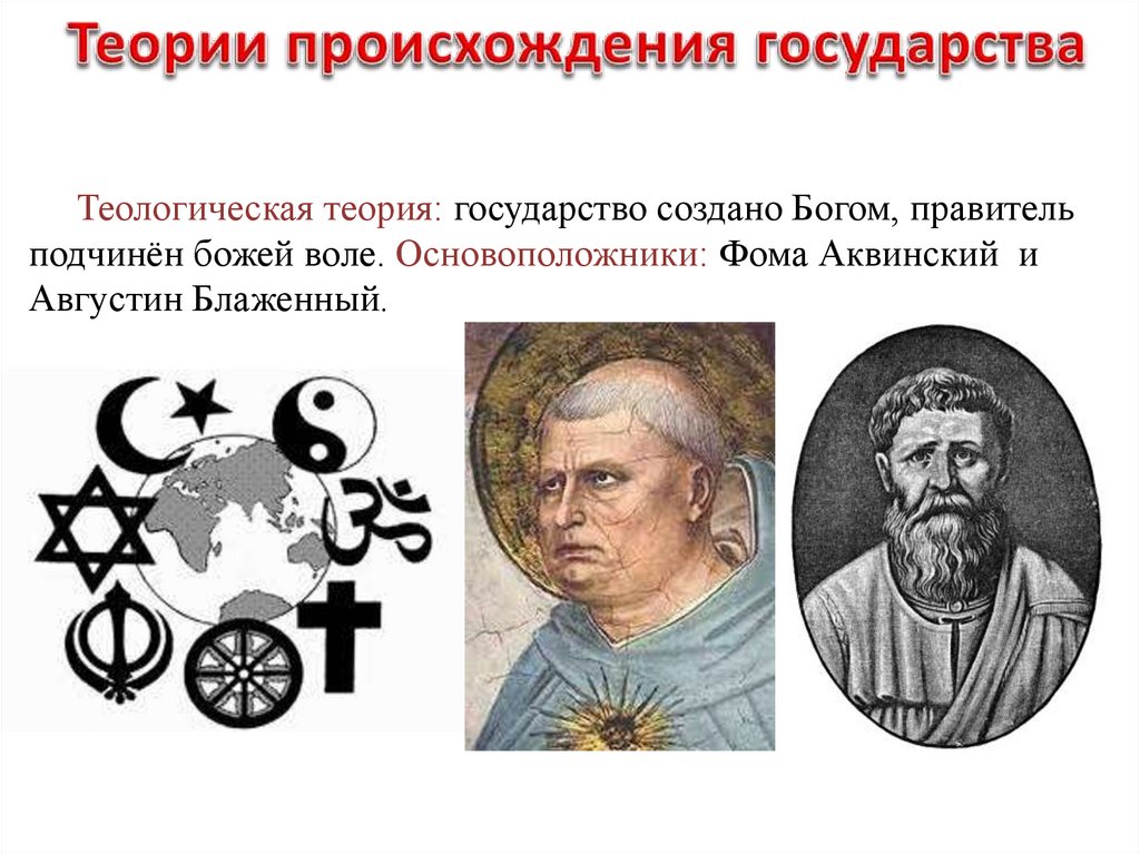 Теологическая теория: государство создано Богом, правительподчинён божей воле. Основоположники: Фома Аквинский и