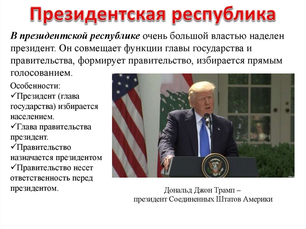 В президентской республике очень большой властью наделенпрезидент. Он совмещает функции главы государства и