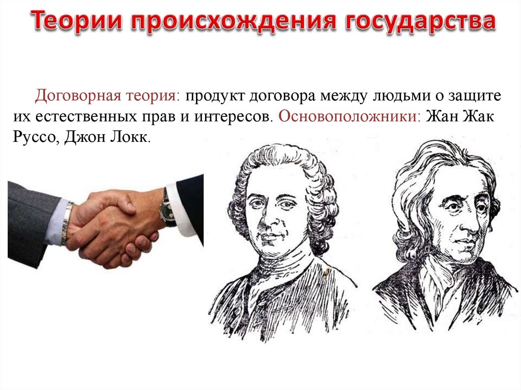 Договорная теория: продукт договора между людьми о защитеих естественных прав и интересов. Основоположники: Жан Жак